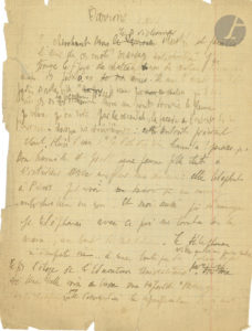 et corrections sur le " mariage anti-chrétien ". Il se souvient d'un ami châtelain qui lui parlait de son château , envahi d'humidité... " Une jeune fille était à l'intérieur avec une fleur aux cheveux : elle téléphonait à Paris pour avoir un mariage entre chrétiens ou non. Et moi aussi qui m'ennuyais je téléphonai avec ce qui me tomba sous la main, un bout de caoutchouc [...]. Je fis l'éloge de l'éducation universitaire, une belle voix de basse me répondit "mariage anti-chrétien" Je demandai la signification de ces mots ".... Au verso, méditation sur les juifs (numérotée 277 au crayon bleu) : " Les Juifs ont renié le Christ parcequ'il fallait que les gentils c'est-à-dire la terre le connut : s'ils ne l'avaient pas renié les juifs seuls auraient été chrétiens, et Jésus était venu pour tous les hommes. Ils ont été sacrifiés à la terre entière et c'est encore la preuve qu'ils sont le peuple de Dieu, Dieu n'appelant à la souffrance [...] que les élus "...