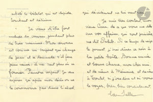 Bribri, Sert Paf et Forain-le-Pieux "... - " Cher ami Vous menez en ce moment une vie vraiment bien déréglée...Comment ! Vous étiez dehors aujourd'hui, à quatre heures ? C'est honteux ! Blague à part, je voudrais bien vous voir un instant au sujet de Escande (entre nous) "... - 30 décembre 1908 : " Je suis allé dîner au petit Sahib, avec le secret espoir de vous y rencontrer, mais il n'y avait que ce vieux maître qui a été charmant, et moi aussi, je pense, mais je ne sais plus qu'en penser. En tous cas, j'ai acheté le bibelot, qui est stupide, touchant et délicieux. Je viens d'être fort malade du cerveau pendant plus de trois semaines. Mon cerveau est comme un serpent qui change de peau et se demande s'il fera peau neuve : il ne sait plus oh se fourrer. Pauvre serpent ! Je veux espérer qu'après mon décès on ne le conservera pas dans l'alcool qui décidément ne lui vaut rien "... - [23.VII.1908] " Les Muses, pour l'instant, me bercent si tendrement que j'en néglige mes lettres, même aux bons amis. En d'autres termes, ces garces parviennent à faire de moi un littérateur : je veux dire un abruti et un crétin "... - Antibes le 11 [1908], au retour d'une longue excursion à pied : " Encore la garce au cul verdâtre ! [...] Le millionnaire La Salle (bruit parisien) n'en mène pas plus large [...] Mais j'avoue que mal d'argent ses supporte mieux sous la pluie d'or de ce beau soleil...qu'il va me falloir quitter la prochaine semaine pour retrouver le gogueneau de Paris et ses balais merdeux "... Il va quitter Marpha... - " Mon vieux Curn, Je tiens beaucoup - Marfa plus encore - à vous voir prendre en avant-goût de la revue dont elle sera la talentueuse étoile. Je compte sur vous mardi prochain, 9 h. à la terrasse du Rat mort d'où nous irons ouïr à la répétition en costumes de cette revue peut-être mort- née "... - 28 avril 1911, rendez-vous au Bar de la Paix : " J'écris à Toulet. J'ai beaucoup aimé le petit Curn de ce matin. C 'est d'un bon sens ingénieux, spirituel et méprisant qui m'a ravi "... On joint une carte de visite a.s. et le faire-part de naissance de son fils Bertrand (1902) ; 3 l.a.s. adressées à Curnonsky lors du décès de La Salle au front en1915, par sa maîtresse Marfa Dhervilly, Paula Bayle et son frère le comte de La Salle ; plus un l.a.s. de Robert Fernier (1942) concernant le poète et le peintre Gustave Courtois.