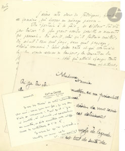 Jaime cette odeur de fabriques, humble et humaine, qui évoque un ménage pauvre "... Remy de GOURMONT. Carte postale a.s. : " Ce sont bien des pommiers. Millet était du pays des pommes ". Jean LORRAIN. 2 L.A.S. - À une amie : " Vous êtes tellement princesse de légende vous-même qu'avec vous on est tout de suite de plain-pied dans le rêve et le monde des chimères "... (2 p. in-8). - À un ami, au sujet d'un " costume du Dante vert à cagoule "... (2 p. in-12). Plus une l.a.s. de Porel à J. Lorrain. Roger MARTIN DU GARD. 2 cartes a.s. à un ami, 1948-1952. François MAURIAC. L.A.S., Chitré mercredi (1 p. in-12) : " pour une fois, je suis de l'avis de Maurras : tant qu'il n'y a ni insulte, ni calomnie, ni incitation au meurtre, on doit accueillir avec indifférence les gentillesses de l'A.F. ".. Henry de MONTHERLANT. L.S. à Huy Tosi, 14 juin 1971, sur D'Annunzio (1 p. in-4).