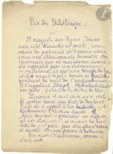 Pierre LOUŸS. Manuscrit autographe, Vie de Méléagre, brouillons, [1893] ; 3 pages in-4 sous chemise titrée (bords effrangés). Trois brouillons pour le début de sa Vie de Méléagre, publiée en tête de sa traduction des Poésies de Méléagre...