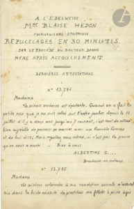 / Repucelages en 30minutes / par le Procédé du Docteur Danois / même après accouchement, il présente les " dernières attestations ", soit six témoignages de femmes heureuses des soins de Madame Hédon. Albertine G. : " C'est tout de même bien agréable de pouvoir se marier avec un honnête homme et de lui dire : "Mais regardez vous-même, si c'est pas la preuve qu'on vous a menti " ; Nini R. âgée de 13 ans : " Je certifie que depuis le jour de l'an jusqu'à aujourd'hui 9 septembre, j'ai vendu cinquante et une fois mon pucelage et que vous me l'avez encore fait hier " ; Charlotte G : " Est-ce que vous ne pourriez pas élargir un petit peu la virginité que je dois à vos soins ? Je ne peux même plus entrer mon doigt et jusqu'à ce que j'aie trouvé un petit mari, je voudrais bien m'amuser un peu toute seule " ; et aussi celui d'un père obligé de " prostituer sa fillette à peine âgée de neuf ans ", qui a pu faire remonter la valeur de l'enfant "... Etc. Provenance : Curnonsky.