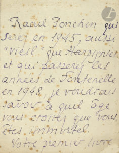 bibliothécaire n'ait jamais entendu parler de lui, ajoutant " que jamais un journal local, ni une revue, ni un bulletin, ni un annuaire ne s'est orné du nom de Ponchon ". Ses recherches lui ont appris que Ponchon " est un type dans le genre de Buonaparte : il a changé une lettre à son nom " et que son père était " Capitaine trésorier d'un régiment bleu, rouge et or ". Ponchon a eu 70 ans et c'est une honte qu'on n'ait pas célébré cet anniversaire : " J'ai fait copier au hasard trente poëmes de lui (d'il y a trente ans). Plus de la moitié sont restés excellents ou plutôt ils le sont devenus. Rien n'a vieilli. Cela écrase toute la poësie burlesque du XIXe siècle, Banville compris, et autre chose itou. Cela passe tous les Scarron, et même St Amant. Ponchon est un homme immortel ". Dans le manuscrit, Louÿs s'adresse à Ponchon : " à quel âge vous croirez que vous êtes immortel. Votre premier livre a quarante frères qui sont mille fois signés Ponchon. Il n'y aura jamais eu d'œuvre satyrique plus considérable que la vôtre lorsque la postérité pourra lire Ponchon en quarante volumes avec album, lexique, index, notes et bibliographies ". On joint une copie du poème L'Eau de Ponchon (1911).