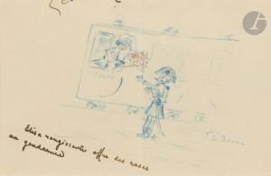 au gendarme ", et porte en bas à droite, au crayon bleu, en guise de signature : " Jhn Lis Brown ", référence au peintre John Lewis Brown (1829-1890). " Il est possible que cet épisode mettant en scène Élisa, la femme de chambre de Méry Laurent et J.L. Brown, le célèbre peintre animalier, ami de Mallarmé, ses situe peu après juillet 1888. En effet, à la demande du poète qui souhaitait voir Méry Laurent figurer sur la couverture du Tiroir de laque, le peintre J. Lewis Brown accompagné de Mallarmé se rendit chez Méry "si toutefois cela t'ennuie, fais dire par Elisa à notre arrivée que Madame est souffrante". C'est peut-être l'occasion d'une première rencontre entre les deux protagonistes de notre dessin qui semblent (au dire de la légende) ne pas en être restés là. Le peintre disparut en 1890. Ce dessin a vraisemblablement été exécuté avant. [...] Est-ce en souvenir de Grandville et pour mieux marquer la prédilection du peintre pour les thèmes animaliers que le poète affuble son gendarme du museau pointu d'un chien anglais ? La scène semble se dérouler dans une gare sur un quai, J.L. Brown attend l'arrivée d'Élisa qui revient de la campagne où elle a réalisé le bouquet qu'elle offre au gendarme " (Laurence Bardury). Exposition Dessins d'écrivains français du XIXe siècle (Paris, Maison de Balzac, 1983-1984, n° 98).
