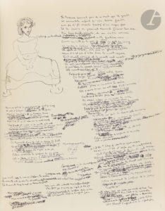 premier jet du dernier poème de Mauriac. Ce poème, écrit en 1940, a été publié, sous le titre " Fragment d'Endymion " dans la revue Poésie 42 (n° 3, mai-juin 1942) ; il a été ensuite recueilli, sous le titre Ébauche d'Endymion , dans le recueil de poèmes Orages (Grasset, 1949), avec cette note : " Le manuscrit d'Endymion date de 1940 ; une première édition d'Orages, publiée en 1925, ne contenait pas ce poème ". Surchargé de ratures et de corrections, le manuscrit, à l'encre noire, comporte dans les marges une vingtaine de dessins de l'auteur, à la plume : têtes de garçons, femme assise. De tout premier jet, ce manuscrit présente une version différente du texte publié, avec des vers ou des strophes plusieurs fois repris, en plusieurs états successifs. " Diane écoute pleurer sur cette humaine trace D'étable, de sueur, de semence et de miel Que la terre encor chaude impose au pur espace Une meute sans cri qu'elle suit dans le ciel. [...] Endymion, pourquoi me préférer la nuit ? Moi-même je suis ombre Dans l'éclat de midi, mon corps humide et sombre Dispense sa ténèbre au gré de ton ennui "... Sur une page ajoutée en tête portant le titre Endymion, Mauriac a inscrit cet envoi : " pour mon ami Mondor François Mauriac juillet 54 ". Ancienne collection du professeur Henri Mondor.
