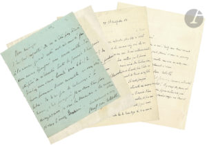 Calineuse à la maison, c'est pourquoi je ne vous l'ai pas envoyée " ; il va en demander à la Revue blanche. - [26 avril]. " Ce que vous me dites de Rubens m'enchante. Pour moi c'est le dieu de la peinture. [...] Il n'y a que lui pour dessiner de ces belles croupes rétives de cavales et de ces beaux abandons de femmes blondes. [...] Il a peint la vraie femme, la femme blonde, sanguine, bonne, sensuelle, ayant les jambes longues, la taille courte, des hanches superbes et du cul "... etc. - Il lui recommande leur confrère Labbé, " comme nous un fervent de Vénus " ; soufrant, il est en retard dans son travail, et demande de lui prêter 200 F. - Il l'a cherché au bal Gavarni : " Il y avait des fesses et des gorges merveilleuses, sans compter les jolies figures sentimentales qui se cachaient dans des chapeaux cabriolets "... - Il aimerait le voir " avant votre départ pour Biarritz "... - Il est très occupé : " C'est une mode fort couteuse que le premier Janvier et je travaille pour que quelques amies aient des bonbons fins, des fleurs et de jolies parures ce jour là. On me pardonne les autres fois d'être un simple amoureux, mais le don de soi-même au commencement de l'année ne suffit plus [...] Et voilà pourquoi mon imagination est en travail d'aventures d'amour pour alimenter mes amours, à moi, et réjouir des amoureuses. De fait rien n'est joli comme le sourire d'une femme si ce n'est ses larmes ".... On joint une l.s. d'E. de Grolier de la Librairie Rombaldi à Curnonsky, lui demandant un article sur Rebell (1945).