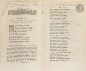 d'éditeur, dos orné. Exemplaire de Sainte-Beuve qui l'a annoté. Envoi a.s. sur le faux-titre : " A Monsieur Sainte-Beuve hommage respectueux Ch. L. Livet 18, quai de Béthune. Paris, ce 20 nov. 1855 ". Le tome I présente dans les marges des annotations autographes de Sainte-Beuve, au crayon, notamment pour les poèmes La Solitude et La Pluye. On retrouve certaines de ces notes, avec variantes, dans les Causeries du Lundi (Garnier, 1870, t. XII, p. 177-178). Les notes en marge de La Solitude occupent les pages 21 à 27 : " Elle ne satisfait point l'homme de sensibilité et de goût comme le font les stances de Racan sur la Retraite ou l'ode de Maynard à Alcippe / touche assez large, libre et naïve mais des tons déplaisants et même incohérents. - Il y a dans ce Rhythme audace, harmonie, douceur, et les deux vers à rimes rapprochées, à rimes plates, qui terminent la strophe, lui donnent par leur monotonie un air de complainte qui ne déplait pas "... Et, à la fin du poème : " Il y a certes d'heureux traits, et de la verve d'ensemble, un certain échauffement de tête et de fantaisie : mais tout cela est bizarre ; tout cela danse aux yeux. Enfin il y a qque aperçu d'une poësie descriptive et contemplative qui vienrda plus tard ". Les notes en marge de La Pluye occupent les pages 92 à 94 : " Il y règne un heureux sentiment de copieux et d'abondance, il y manque pour être un petit chef-d'œuvre digne d'Horace, et de l'école de Malherbe, un je ne sais quoi de travail, de resserrement de style et de soin d'expression [...] c'est assez bien, mais c'est trop lâché "... Et, à la fin du poème : " On ne finit pas par une cheville. Quelle différence avec ce que faisait Horace ! conçoit-on un dernier vers aussi faible et aussi lent pour terminer la pièce et pour couronner une strophe qui veut rendre surtout la joie, le trépignement ". Les pages du tome II n'ont pas été coupées.