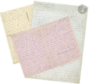 Paul-Jean TOULET. 3 L.A.S., [1913-1919], à Mme Haydée Level ; 2 pages in-8 et 1 page in-12 (au verso d'une carte postale), une adresse et 2 enveloppes. Charmante correspondance galante. Saint-Loubès 17 janvier 1913. " Mon intention étant de vous...
