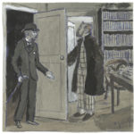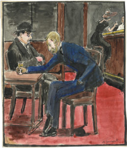 Toulet rendant visite à son voisin Curnonsky (ils habitaient le même immeuble, 14 square de Laborde), lavis et gouache. Toulet et Curnonsky au bar du Café de la Paix, aquarelle gouachée. Une dame rendant visite à Curnonsky, lavis et gouache, titre au dos : " Five o'clock chez Curnonsky ". Une dame dans le cabinet de travail-bibliothèque de Curnonsky, lavis et gouache.