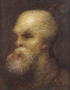 [Paul VERLAINE]. Auguste JOUVE (1846-c.1905). Portrait de Paul Verlaine ; huile sur carton, signée en bas à droite, et titrée au dos ; 30 x 24 cm Portrait en buste de Verlaine.