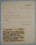 avril 1890. 2 pp. in-8, enveloppe conservée, une lettre sur papier de deuil ; CLESINGER Auguste (1814-1883) L.A.S. à Auguste Boulard, Labarre, 31 mars 1865. 1 p. in-8 ; COUDER Auguste (1789-1873) L.A.S. au duc de Damas, Paris, 6 juin 1828. 1 p. in-folio. Document également signé par le Duc de Damas. A propos d'un tableau représentant la Dauphine posant la première pierre du monument aux victimes de Quiberon ; DETAILLE Edouard (1848-1912) L.A.S. (s.l.) 29 septembre 1884. 1 p. pt. in-8 ; DUBOUT Albert (1905-1976) & BALIVET Suzanne (1904-1985) photomontage, dédicacé et signé, (c. 1955). OEuvre publiée en 1955 dans l'ouvrage Corridas d'Albert Dubout ; DUFY Raoul (1877-1953) L.A.S. Paris, 11 mars 1921. 2 pp. ½ in-8. Raoul Dufy explique pourquoi il ne veut pas régler sa facture à l'Argus de la Presse. Joint à cette lettre, les deux courriers liés au recouvrement de la facture, ainsi qu'une lettre dactylographiée concernant les poursuites contre M. Dufy ; FINI Léonor (1907-1996) L.A.S. à Rafaèle Billetdoux, Chatelguyon, 21 octobre 1971. 2 pp. in-4 ; enveloppe jointe. Elle demande à sa correspondante "[...] si vous n'étiez pas peintre à travers cette sensualité [...]" ; FLAMENG Léopold () L.A.S. Paris, 7 mai 1968. 1 p. in-8 ; FORAIN Jean-Louis () L.A.S. (s.l.) 1er février 1900. 1 p. in-8 ; INGRES Jean Auguste Dominique (1780-1867) L.A.S. à M. Gustave Planche (s.l.n.d. « 26 fev »). 1 p. in-8. Adresse, marques postales. Il indique « je n'ai point mis le pied au jury d'admission […] c'est d'ailleurs de conviction que je n'en ferai jamais partie […] » ; [GROS Jean-Antoine] BERNARD Emile (1843-1902) M.A.S. (s.l.n.d.). 10 pp. in-4. Manuscrit intitulé « le Cas Gros » sous-titré « La peinture est chose mentale - Léonard de Vinci) ». Très intéressant premier jet de ce réquisitoire contre la peinture de David et d'Ingres. Emile Bernard accuse David d'avoir fait dévier le baron Gros de son génie naturel ; [GRANGER Geneviève ()] dessin sur papier calque. 1 p. (18 x 17,5 cm) ; LECOMTE Paul () L.A.S. (s.l.) (s.d. "9 juin") 1 p. in-8 avec dessin. Vue de Chaumont sur Loire ; MADYOL Jacques (1871-1950) Dessin aux crayons (noir et marron), dédicacé "très sympathiquement à M. et Mme Cadio" Nice, 24 avril 191". 1 p. in-8 ; MAILLAUD Fernand (1862-1948) 3 L.A.S, 1 C.A.S. à Maurice Feuillet, Paris et Val Cros, 16 mars, 25 mai 1925, 23 décembre 1928 et (s.d.). 11 pp. in-8 et in-folio. 3 enveloppes conservées. Il lui expose entre autres sa philosophie artistique, évoque la pauvreté de certains artistes ; MONTMARTRE "République de Montmartre Brevet de Vertu Civique Décerné à. Louis-Camille de Hogues fils", avec les signatures autographes des grands noms de l'époque (fondateurs de la République) Maurice Millière, Francisque Poulbot, Henri Avelot, Lucien Lecocq, Paul-Élie Ranson, George Roux, etc. Contrecollé, papier insolé, (25 x 26 cm.) ; PISSARRO Paul-Emile (1884-1972) C.A.S. (s.l.n.d. « 29 juillet »). 1 p. in-12. Il demande à des amis de transmettre ses félicitations ; POPELIN Claudius () Lavis à l'encre, circa 1860. 1 p. (15 x 10 cm) Beau dessin indication "PM Galbois" ; SUPERVIELLE Jules (1884-1960) 2 L.A.S. à la sculptrice Antoinette Sloimovici, 2 Lettres à l'en-tête de l'administration des Monnaies. 4 pp ½. in-8 et in-folio. Sur l'édition de la Médaille Supervielle ; VAN DONGEN Kees (1877-1968) L.A.S. à Emile Bayard, Paris, 22 janvier 1926. 1 p. in-folio. En-tête à son adresse. Il autorise M. Bayard à reproduire sa peinture « Rieuse » dans un ouvrage sur la beauté humaine.