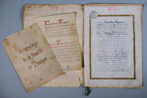 signée avec cartouche centrale entourée des apanages. Généalogie assez sommaire de Charles de Torquat venu en France dans la suite de la Reine Catherine de Médicis en 1558. Sermon du prêtre manuscrit de 8 pages remis aux époux comme il était d'usage par le curé de St Germain de Rennes le 2 juillet 1890.
