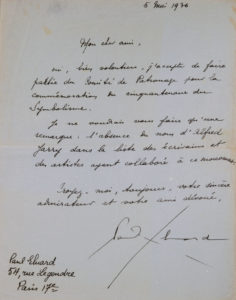 d'Alfred Jarry dans la liste des écrivains et des artistes ayant collaboré à ce mouvement […] ». Lettre probablement adressée à André Jaulme à qui l'on confia dans un premier temps l'organisation de l'exposition.