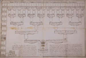 colombier (petits trous et qq. mouillures claires hors du texte le long d'un pli). Important tableau montrant l'ascendance de François-Jacques-Henri Fournier-Chauvigny, marquis de Quincy. Les blasons ne sont pas renseignés, hormis celui du titulaire. Le texte figurant au pied de l'arbre se prolonge dans un encadrement sur 18 lignes au verso.