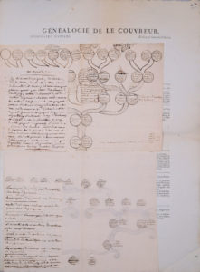 [Généalogie]. [Le Couvreur]. Dossier généalogique concernant la famille Le Couvreur (Amiens). XVIIIe siècle. Comprenant : - un placard imprimé, daté du 28 novembre 1718, attestant qu'Adrien Le Couvreur sera inscrit dans le catalogue des...