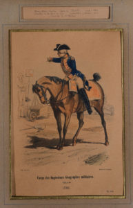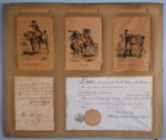 novembre 1815. Pièce imprimée sur parchemin, 19,5 x 31,35 à vue, renseignée à la main, signature du maréchal duc de Feltre (un accroc). 2. Autorisation donnée par le Duc de Berry à Monsieur de Mailly de porter la décoration de la Fleur de Lys. Lille, août 1814. Pièce imprimée sur papier, 19,5 x 14,5 à vue, renseignée à la main, signature du comte de Nantouillet (rousseurs). 3. Trois gravures coloriées (brunies) d'après les dessins de F. Philippoteaux montrant des cavaliers militaires français, surmontées de 3 légendes manuscrites où l'on a mentionné les noms d'Ibos et de Mailly.