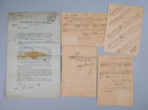 [MUSIQUE] Ensemble de documents rédigés par des musiciens ou compositeurs ou à propos de musique. Principalement des lettres autographes signées, des lettres signées, un contrat, un télégramme, des manuscrits musicaux, un manuscrit etc....