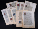 [Enluminure]. Ensemble de 10 feuillets disparates extraits d'un ouvrage incunable imprimé sur papier, chacun illustré d'une initiale enluminée avec dorure, soit 10 initiales ornées vers 1490- 1500. (Des défauts aux feuillets dont travaux de vers...