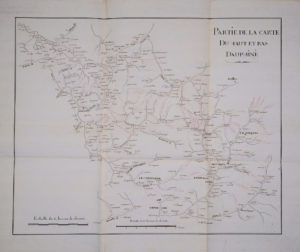 [Manuscrit]. [Carte géographique]. [Dauphiné]. Partie de la carte du haut et bas Dauphiné. XVIIIe siècle. Carte manuscrite à l'encre rouge et noire sur une feuille et une demi-feuille assemblées de papier vergé filigrané aux raisins. 43,5 x...