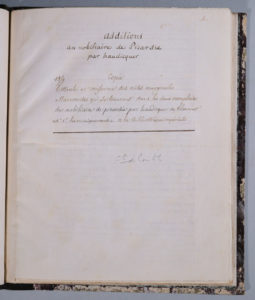 dorés. Manuscrit établi d'après les notes marginales relevées sur les deux exemplaires du Nobiliaire de Picardie conservés à la Bibliothèque impériale. La seconde partie s'intitule : « Notice sur Jean Haudicquer de Blancourt et sur son nobiliaire de Picardie ». Manuscrit soigné avec corrections et ratures. Ex-libris de la bibliothèque de Merlemont.