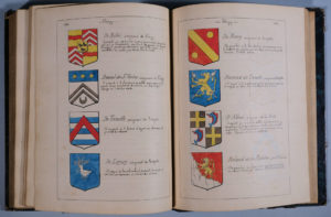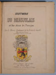 (table), fig., demi-basane noire époque, dos à 4 nerfs, auteur et titre dorés (coupes et coins émoussés, coiffes et nerfs frottés sans gravité). Manuscrit soigné, qui s'appuie probablement sur l'ouvrage du baron de La Roche La Carelle publié chez Perrin à Lyon en 1853. Une première partie concerne l'histoire et offre par ordre chronologique des notices sur les sires de Beaujeu depuis les origines jusqu'à Louis Philippe Joseph d'Orléans, baron de Beaujolais en 1785. Une seconde partie, la plus étendue, intitulée : « État alphabétique des paroisses du Beaujolais avec la mention et succession des fiefs qui se trouvaient en chacune d'elles » occupe les pages 191 à 455 et se trouve illustrée de 184 blasons dessinés et peints en couleurs. Les armes de Beaujeu sont dessinées et peintes sur la page de titre. La fin du volume renferme des listes de personnalités notables, dont les dignitaires du chapitre de Beaujeu.