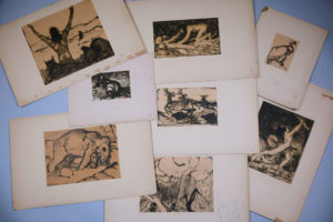 [Gravure]. Henri DELUERMOZ (1876-1943). Compositions pour l'illustration du Livre de la jungle paru en 1941 chez Creuzevault. Ensemble de 42 monotypes en noir et blanc, collés sur feuilles de carton fort, volantes. Les tirages ont des dimensions...