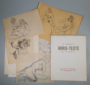 « Hors-texte pour les oeuvres de Villon », et portant cette mention imprimée « Ces hors-texte sont destinés à quelques amis. Point besoin de longues explications avec eux... Plus que jamais, j'ai fui la spécialisation dans un poncif et l'école des trois pommes. Et j'ai évité, autant que possible, toute espèce de pruderie. Ed. Mézerette, Xbre 1958 ».