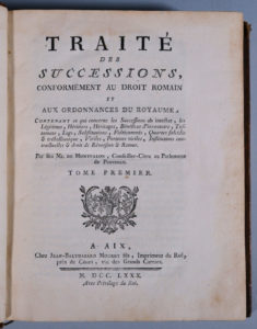 BARRIGUE DE MONTVALON (André de). Traité des successions conformément au droit romain et aux ordonnances du royaume... A Aix, chez J.-B. Mouret fils, 1780. 2 volumes in-4, XVI-715 + VIII-564 p., basane marbrée époque, dos à 5 nerfs, pièces de...