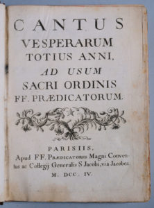 [Antiphonaire]. CANTUS vesperarum totius anni, ad usum sacris ordinis FF. Praedictorum. Parisiss, apud. FF. Praedicatores, 1704. In-4, [1] f. (titre), 253-LXXXXII p., veau havane glacé époque, dos à 5 nerfs, trace d'une pièce de titre, tranches...