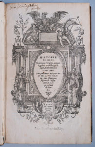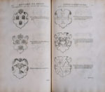 (dont le titre illustré), 365 p., [13] f. (le 1er blanc), fig., veau havane époque, dos à 6 nerfs, titre et fleurons dorés, plats bordés d'un filet dorés avec médaillon central doré, filet à froid aux coupes, tranches dorées, dos remplacé avec fragment du dos original conservé et autres restaurations (épidermures aux plats ; qq. bruniss. ordinaires en marge ; 2 planches en déficit). Édition originale de cet ouvrage qui se distingue par son illustration entièrement gravée sur bois, comprenant un titre typographié décoré d'un cadre architectural orné d'allégories, les figures de plus de 70 armoiries de maires et officiers municipaux, une page de monnaies locales, les armes de la ville dans un encadrement orné à pleine page ; initiales et bandeaux. Il manque à cet exemplaire la carte du Berry et la vue de Bourges. Provenance : Giovanni Secondo Salmatoris, membre du Sénat de Nice au XVIIIe s. (ex-libris manuscrit aux titre et garde). (Brun, Livre illustré de la Renaissance, 153 ; USTC 7242).