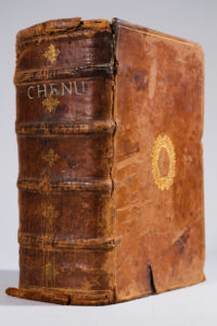 CHENU (Jean). Réunion de deux ouvrages publiés à Paris chez la Vve de G. Chaudière, 1603, en un très fort volume in-4, basane havane XVIIe s., dos à 5 nerfs, fleurons dorés, titre peint postérieurement, médaillon doré au centre de chaque...