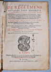 plat (rel. frottée et usée, mors et charnière int. fendus ; mouillures sporadiques sur l'ens. du vol. et plus soutenues sur le 2e ouvrage). 1. Recueil de réglemens notables tant généraux que particuliers, donnez entre ecclésiastiques, pour la célébration du service divin ; juges, magistrats et autres officiers royaux et des seigneurs justiciers inférieurs et subalternes pour l'exercice de leurs offices, rang, séance, prérogatives. 2e éd. revue et augmentée. [20] f., 851 p. - 2. Cent notables et singulières questions de droict, décidées par arrest mémorables des cours souveraines de France... [8] f., 621 p., [8] f. OEuvre majeure de Jean Chenu (1559-1627), de Bourges, avocat au Parlement de Paris. L'on trouve quelquefois ces deux ouvrages séparément mais ils doivent être réunis, le second étant mentionné sur la page de titre du premier. Provenance : Bonifax (Bugey ; ex-libris armorié peint au contreplat).