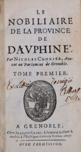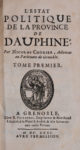 CHORIER (Nicolas). Le nobiliaire de la province de Dauphiné. A Grenoble, chez F. Champ, 1697. 4 volumes in-12. - [Avec, du même] : L'estat politique de la province de Dauphiné. A Grenoble, chez Philippes, 1671-1672. 4 volumes. Soit 8 volumes...