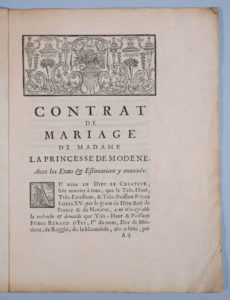 [Joaillerie]. CONTRAT de mariage de madame la princesse de Modène, avec les états et estimations y annexés. [Paris], de l'Impr. de d'Houry, 1737. In-4, 14 p., [1] f., broché, sans couv. (page de titre brunie en marge). Rare factum produit par...