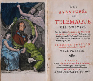 [Reliure aux armes]. FÉNELON (François de). Les avantures de Télémaque, fils d'Ulysse. A Paris, chez F. Delaulne, 1720. 2 volumes in-12, [1] f., LVIII p., [1] f., 503 p. + [1] f., 447 p., [1] f. (privil.), fr., pl., veau havane époque ; dos à 5...