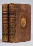nerfs, pièceds de titre maroquin grenat, tomaisons frappées, caissons ornés, armes dorées à chaque plat, tranches rouges (frott., défauts dont ue coiffe de queue découverte, un mors fendu en tête ; bruniss. & qq. saliss. sans gravité). « Seconde édition conforme au manuscrit original ». Elle est illustrée d'un portrait gravé par Duflos d'après Bailleul, d'un frontispice au t.2, d'une carte et de 24 planches d'après Bonnart, la plupart gravées par Giffart. Le portrait et les 7 premières planches ont été coloriés. Provenance : (Cohen, 379-380, pour la première éd. en 1717).