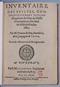 [Livre du XVIe siècle]. FRONTON DU DUC. Inventaire des faultes, contradictions, et faulses allégations du Sieur Du Plessis remarquées en son livre de la saincte Eucharistie… A Bourdeaus, par S. Millanges, 1599. In-8, [8] f., 679 p., [6] f....