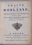 LA ROQUE (Gilles-André de). Traité de la noblesse et de toutes ses différentes espèces. A Rouen, chez P. Boucher aîné, 1735. In-4, [12] f., 426 p., [1] f., 80-52-163 p., [2] f. veau havane moucheté époque, dos à 5 nerfs orné, tranches...