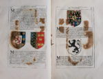 fig., cartonnage ancien noir, pièce de titre maroquin rouge au dos (dos usé avec lacunes, frottements ; des taches brunes voire des trous dans le papier causés par la peinture ancienne ; pages de titre intermédiaires non conservées). Nouvelle édition de cet ouvrage, revue, corrigée et augmentée par Claude Morel. Elle est illustrée de plus 500 figures d'armoiries gravées sur bois dans le texte. Exemplaire dont toutes les figures ont été anciennement coloriées, dans un état modeste, mais qui se distingue par l'enrichissement dont il a fait anciennement l'objet : des pages manuscrites avec des armoiries peintes ont été ajoutées à certaines parties : 2 pages (59 et 60) pour la 2e partie ; 1 page ½ 49 et 50 pour la 3e partie ; ½ page pour la 4e partie ; et surtout, 16 pages (76 à 91) pour la 5e partie consacrée aux maréchaux ; et enfin, une page pour la dernière partie. Provenance : Ex-dono ms. ancien de Pierre Delaplanche aux Oratoriens de Saint-Magloire ; mention d'une vente en 1764 à La Haye ; ex-libris au pochoir Veaernewyck ; ex-libris gravé XIXe s. C. Van Baviere, Bruxelles. (Saffroy 12877).