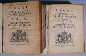 (menus défauts dont 2 coins découverts ; qq. ff. déréglés, bruniss. légères). Recueil de lois promulguées par Charles Emmanuel III, duc de Savoie et roi de Sardaigne. Texte bilingue français et italien sur 2 colonnes. Ex-libris manuscrit ancien en tête du titre.