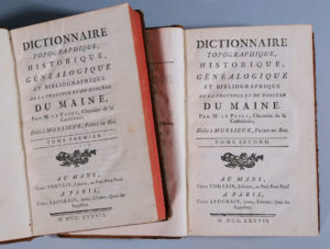 LE PAIGE (André-René). Dictionnaire topographique, historique, généalogique et bibliographique de la province du diocèse du Maine. Au Mans, chez Toutain ; à Paris, chez Saugrain, 1777. 2 vol. In-8, VIII-LXII-544 p. + [2] f., 602 p., [2] f.,...