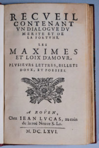 [Gaudriole]. [LUCAS (Jean)] [Éd.]. Recueil contenant un dialogue du mérite et de la fortune, les maximes et loix d'amour, plusieurs lettres, billets doux, et poésies. A Rouen, chez J. Lucas, 1666. Petit in-8, [3] f., p.3-163, demi-maroquin à...