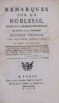 MAUGARD (Antoine). Remarques sur la noblesse, dédiées aux assemblées provinciales. A Paris, chez Lamy, 1788. In-8, [2] f., LXX-335 p., [2] f., demi-velin ivoire à coins début XXe s., dos lisse, auteur, titre, fleuron et date peints en rouge et...