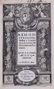 [NOTICE COMPLETE A VENIR]. MONYER. Remonstrances, faictes à l'ouverture de la Cour de Parlement de Provence. A Paris, par Martin Verac, 1614. In-8. Maroquin grenat.
