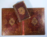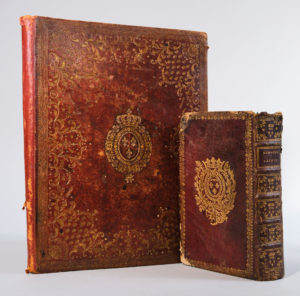 caissons ornés avec pièces d'armes, plats bordésd'une double roulette avec grandes armoiries au centre, tranches dorées (rel. usée avec accidents ; trav. de vers en marge des 20 premiers f., mouillures claires). Reliure aux armes de Louis-Philippe d'Orléans (1725-1785). On joint : - Sous-main ou chemise XVIIIe s., in-4°, en maroquin rouge aux armes royales, les plats richement décorés aux petits fers, probable réemploi d'une reliure, dos en basane rouge postérieur (frottements, un coin émoussé).
