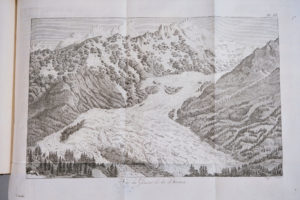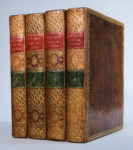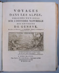 dos lisse orné, pièce de titre et de tomaison maroquin rouge et vert, roulette dorée bordant les plats et les contreplats, coupes guillochées, tranches dorées (lég. frott. sur les mors et coupes, des coins un peu émoussés, petit accroc sur une coiffe de queue). Bel exemplaire, grand de marges et en reliure uniforme soignée, de ce célèbre ouvrage, précurseur à bien des égards de toutes les publications relatives aux études alpines et à l'alpinisme. Les tomes 3 et 4 sont en édition originale. L'illustration entièrement gravée sur cuivre se compose de vignettes, d'une carte dépliante et de 21 planches.
