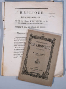 [Choiseul]. RÉPLIQUE de M. Delamalle, pour les dames d'Estampes et de Choiseul d'Aillecourt ; contre le sieur Rouillé de Boissy. Paris, Impr. Delance, [1807]. In-4, [1] f., 55 p., broché sans couv. tel que paru (1er f. défraîchi). On joint : -...