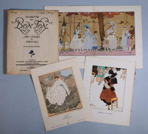 GAZETTE DU BON TON (La). Arts, modes et frivolités. Paris, Librairie centrale des Beaux-Arts, puis L. Vogel. 1915-1925. Réunion de 20 numéros, en feuilles, l'ensemble dans un emboîtage contenant 7 chemises demi-maroquin de couleurs différentes,...