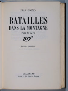 GIONO (Jean). Batailles dans la montagne. Paris, Gallimard, 1937. In-8, 364 p., box brun, dos lisse orné d'un décor mosaïqué en 4 teintes de vert, auteur et titre dorés, plats recouverts de papier gris laissant une bande de box latérale, tête...