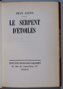 GIONO (Jean). Le serpent d'étoiles. Paris, Grasset, 1933. In-12, 249 p., demi-chagrin abricot à coins, dos orné d'un jeu de fleurons et filets dorés, auteur, titre et date dorés, filet doré aux plats, tête dorée, non rogné, couv. et dos...