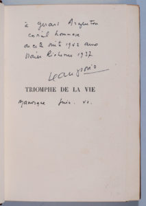 dorée, témoins, couv.et dos conservés [Semet et Plumelle] (lég. rousseurs au fx-titre et dernier f.) Édition originale : un des 45 exemplaires sur vélin d'Arches (n°33). Envoi autographe signé de l'auteur : « A Gérard Argenton, cordial hommage de cette suite 1942 aux Vraies Richesses 1937, Jean Giono, Manosque, juin 1942 ».